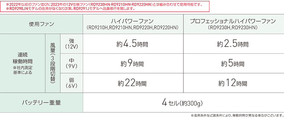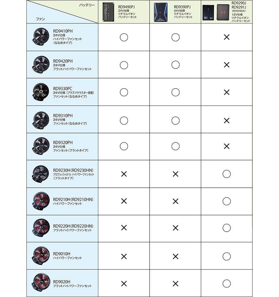 | ※2023年と2024年の24V仕様ファン(RD9410PH・RD9420PH・RD9330PC・RD9310PH・RD9320PH)とは組み合わせて使用できません。 2022年以前のファン並びに2023年の12V仕様ファン(RD9230HN・RD9210HN・RD9220HN)とは組み合わせて使用可能です。 ※ご購入の前に必ずファンとバッテリーの互換性をご確認ください。 |