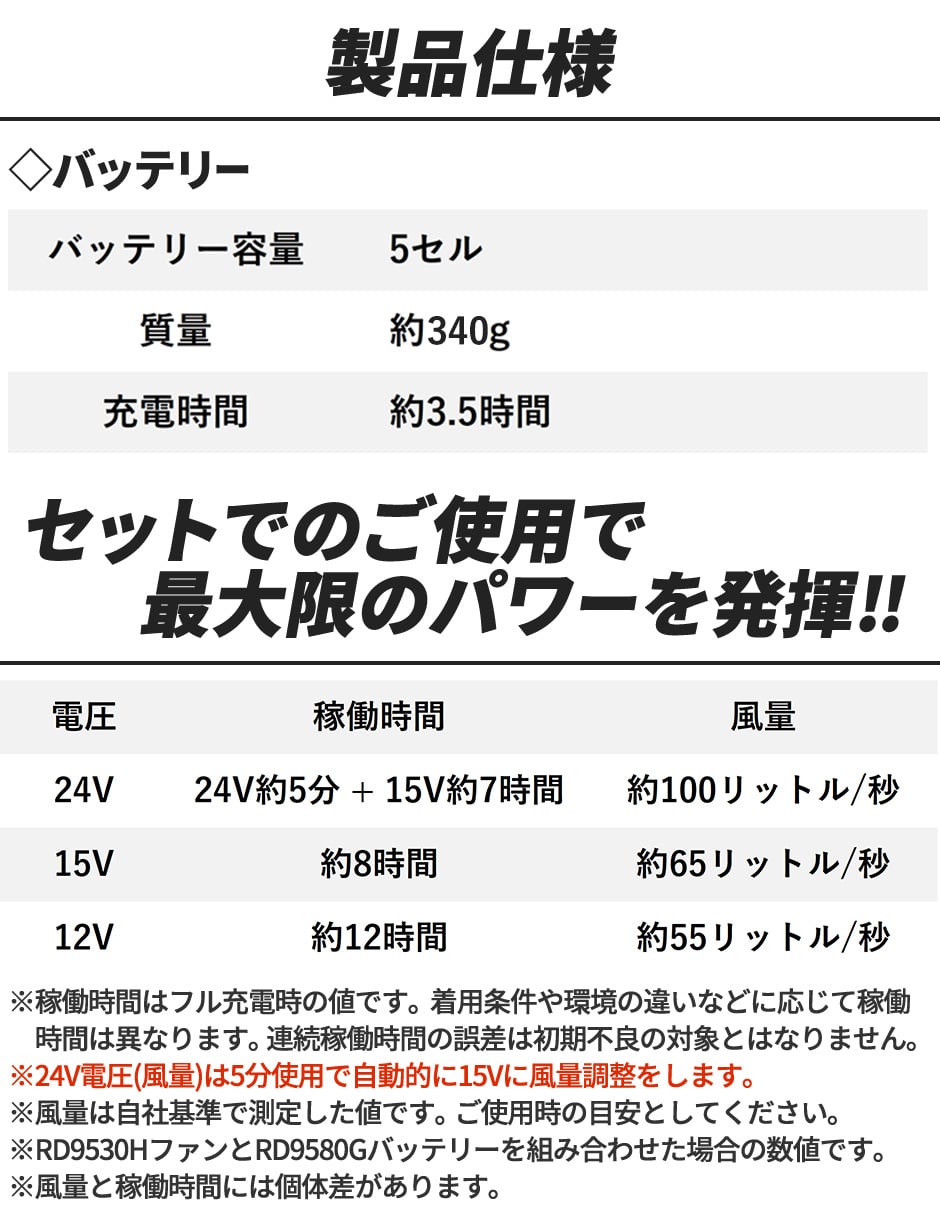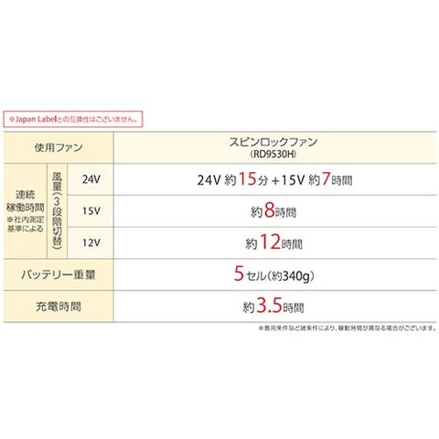 | ■連続稼働時間 スピンロックファン(RD9530H)使用時 24V 約15分+15V 約7時間、15V 約8時間、12V 約12時間 ■バッテリー容量:5セル(約340g) ■充電時間:約3.5時間 |