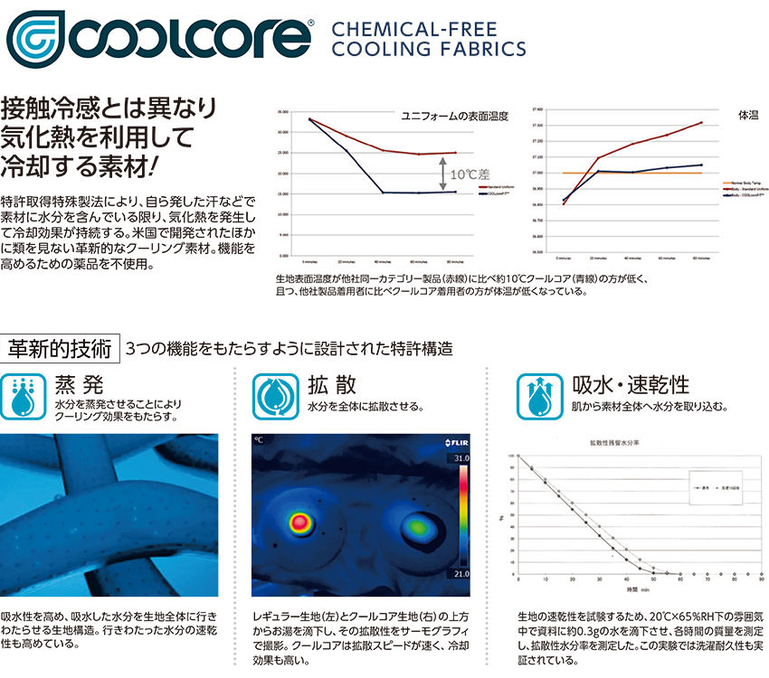 | クールコア(冷却素材)、吸水拡散、ストレッチ、反射材、清涼素材、吸汗速乾 |