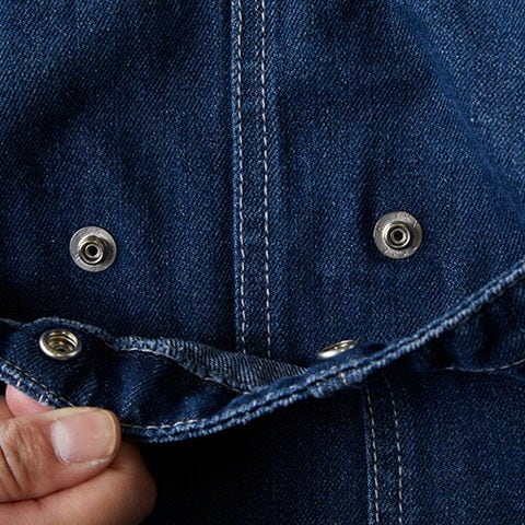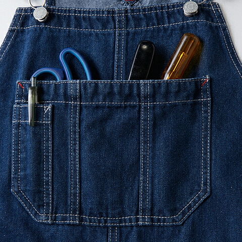| 胸ペン差し、タックボタン、隠しドットボタン、ツールポケット、ハンマーループ |