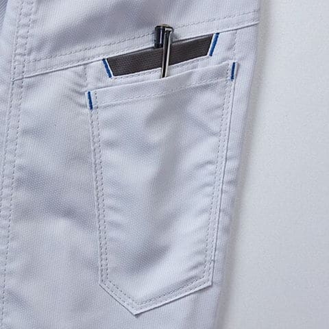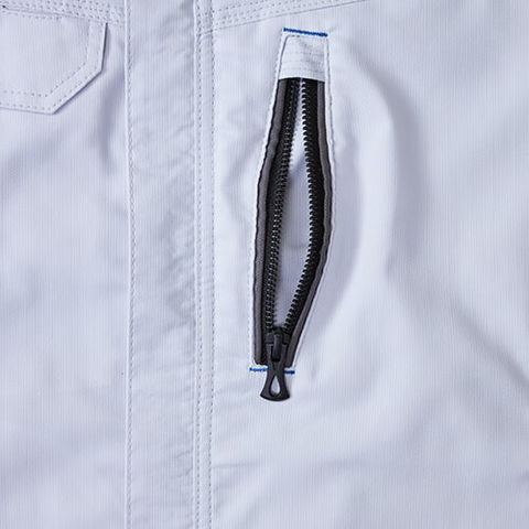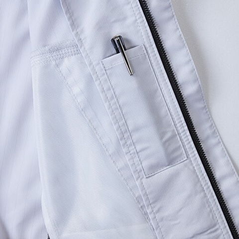 | 背メッシュ、ファスナー隠し、デオドラントテープ、脇メッシュ、袖ペン差し、胸ファスナーポケット、内ペン差し、ウエストアジャストボタン |