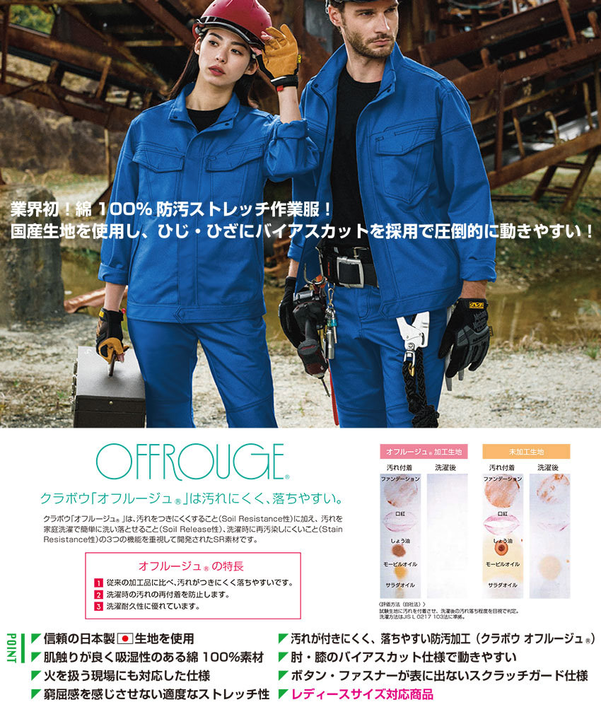 業界初!綿100%防汚ストレッチ作業服!国産生地を使用し、ひじ・ひざにバイアスカットを採用で圧倒的に動きやすい