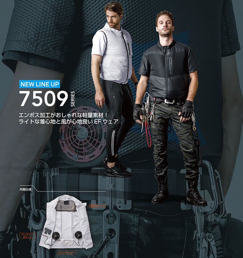 | 現在空調服(R)という用語が世間で使用されておりますが、本来「空調服(R)」とは株式会社空調服が夏場の衣服内気候環境を改善することを目的として発売している「電動ファン内蔵上着」の商品名ですので、こちらの商品は「空調服(R)」ではなく、同じような効果を目的として株式会社空調服以外のメーカーより発売されているEFウェア(電動ファン付きウェア)シリーズでございます。 |