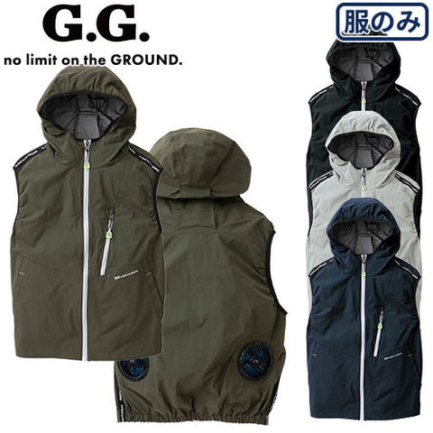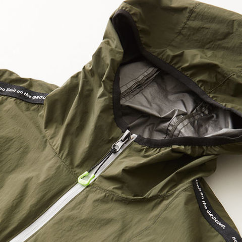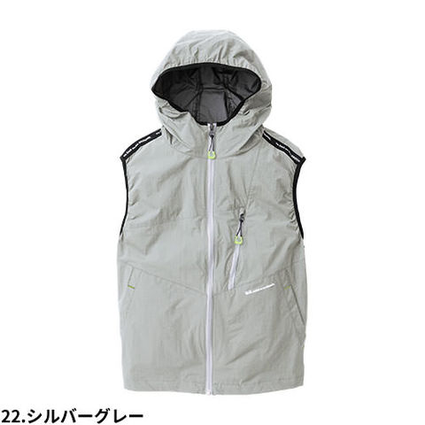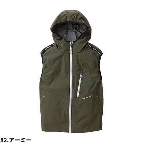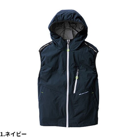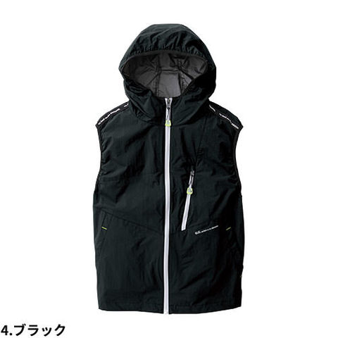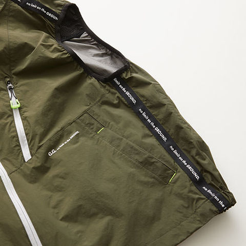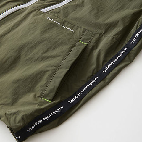 ロゴ入りラインテープ、エアースルーネック、オリジナルロゴ入り引手、脇ポケット配色カン止め、ロゴプリント、ファン取付孔、バッテリーポケット、ウエスト調整ドローコード、後ウエストゴム、風洞メッシュ