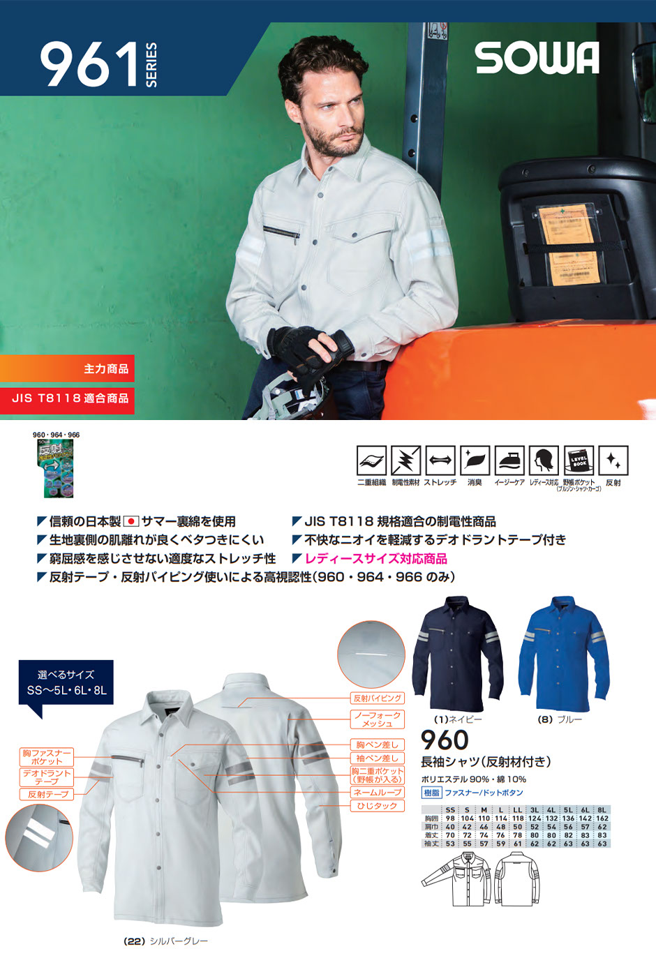 長袖シャツ 反射材付き 作業服 作業着 シャツ 桑和 SOWA 960 春夏 ストレッチ シンプル 着やすい 現場用 ワークウェア ワークシャツ 人気 制電 消臭 ペン差し ポケット付き メンズ レディース おしゃれ オシャレ かっこいい