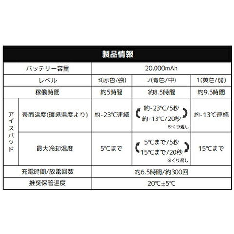 | アイスパッド 13111 ■重量:約62g(アイスパッド1個) ■サイズ:76mm×23mm モバイルチャージャー20,000mAh(PD) ■重量:約400g (モバイルチャージャー1 個) ■サイズ:68mm×142mm×29mm USBケーブル USB Type-C to Type-C ■稼働時間/アイスパッド表面温度 3(赤色/強):約5時間/ー23℃(連続) 2(青色/中):約8.5時間/ー23℃(5秒)→約ー13℃(20秒)繰り返し 1(黄色/弱):約9.5時間/約―13℃(連続) |