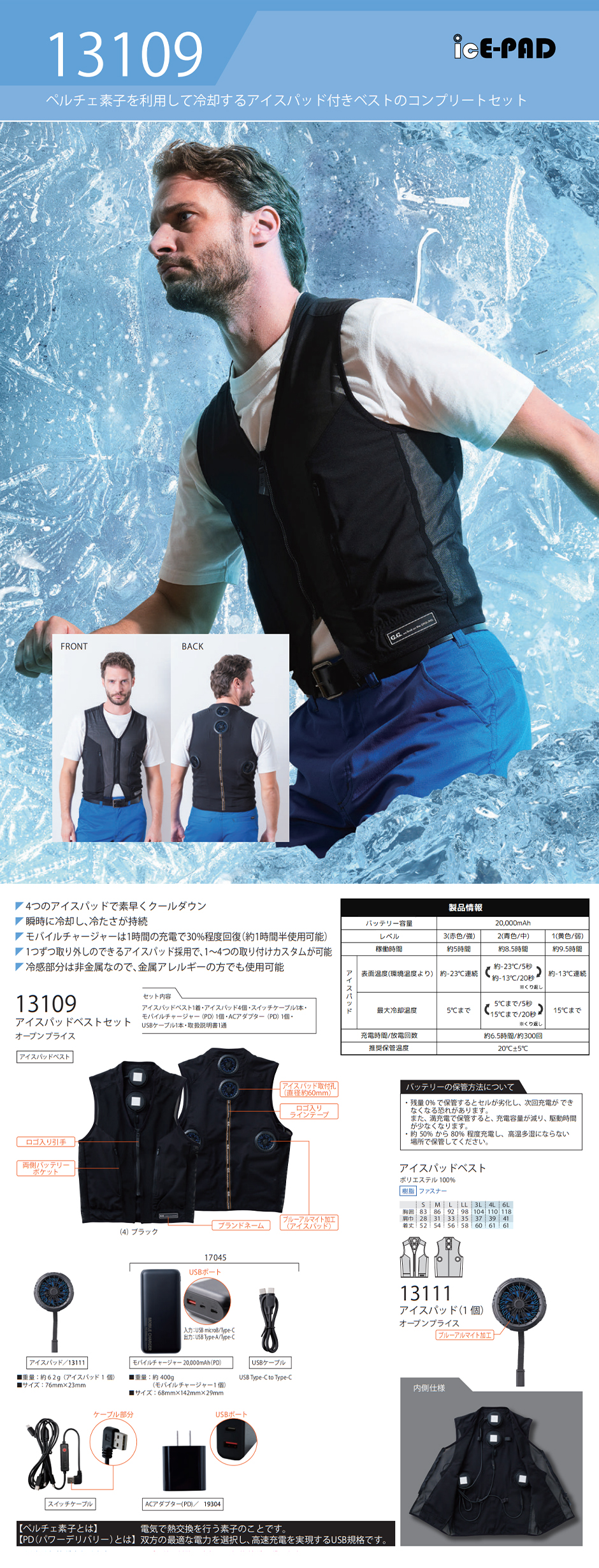 | アイスパッドベスト1着 13111:アイスパッド4個 17045:モバイルチャージャー(PD)1個・USBケーブル1本 スイッチケーブル1本 19304:ACアダプター(PD)1個・取扱説明書1通 |