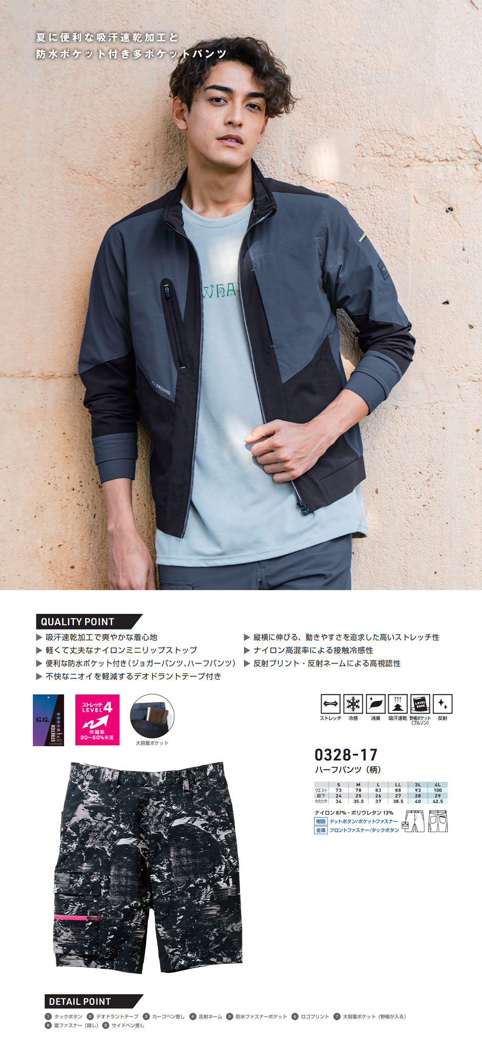 | 吸汗速乾加工で爽やかな着心地軽くて丈夫なナイロンミニリップストップ ナイロン高混率による接触冷感性 縦横に伸びる、動きやすさを追求した高いストレッチ性 便利な防水ポケット付き(ジョガーパンツ、ハーフパンツ) 反射プリント・反射ネームによる高視認性 不快なニオイを軽減するデオドラントテープ付き |