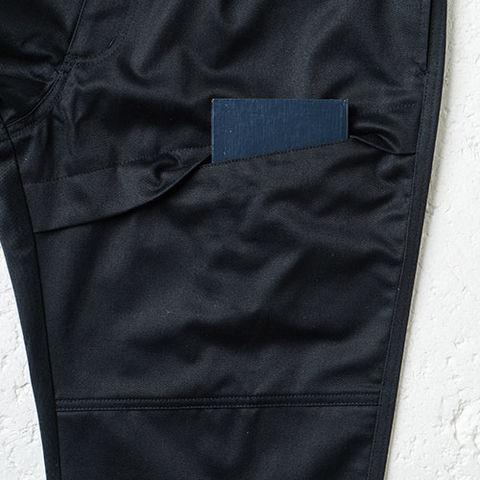 前カン、デオドラントテープ、ひざ補強布、裾紐通しホール(※紐はついていません)、ヒップポケット(野帳が入る)、ウエストゴム、ヒヨク付きカーゴポケット(野帳が入る)