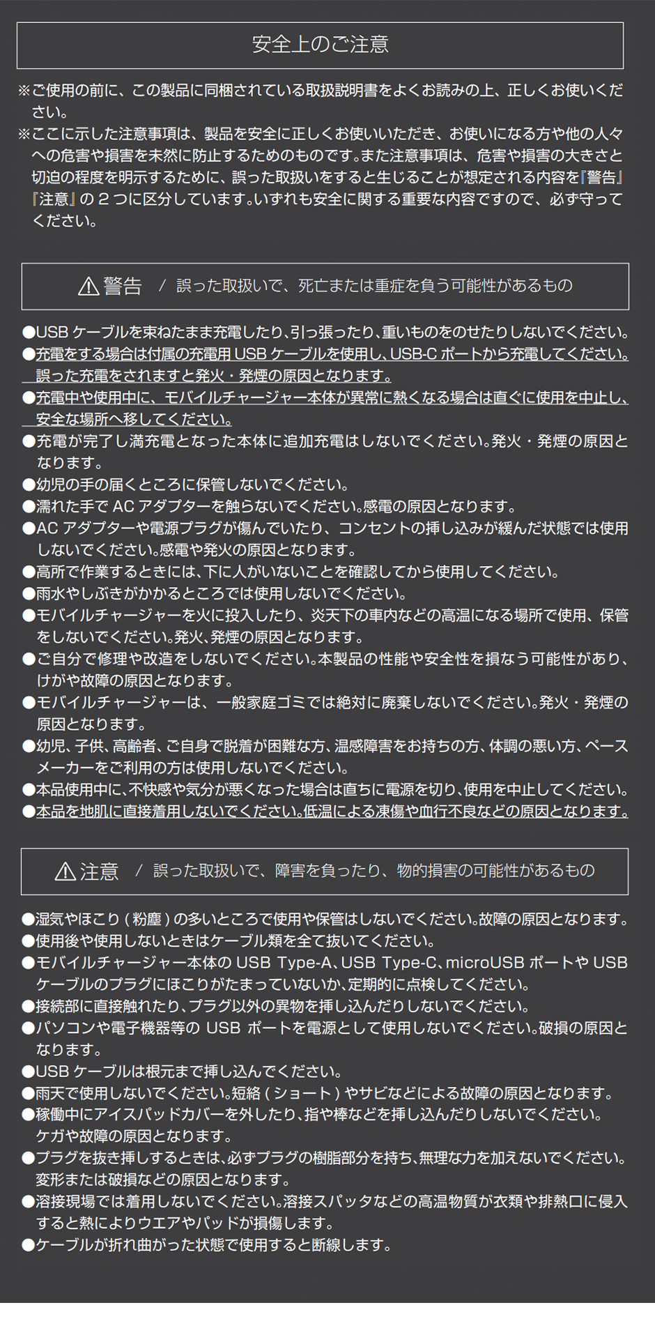 | ■重量:約310g(モバイルチャージャー1個) ■サイズ:70mm×109mm×29mm ■容量:20,000mAh 残量デジタル表示 出力USBポート(Type-A,Type-C) 入力USBポート(USB microB/Type-C) 充電用USBケーブル:USB Type-C to TypeC |