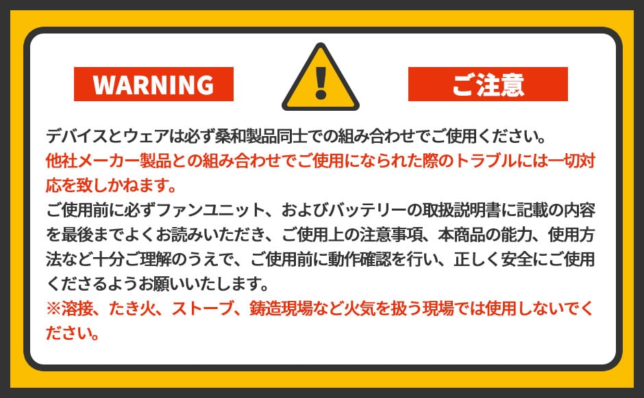 | デバイスとウェアは必ず桑和製品同士での組み合わせでご使用ください。他社メーカー製品との組み合わせでご使用になられた際のトラブルには一切対応を致しかねます。 |