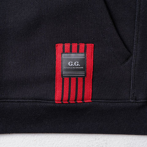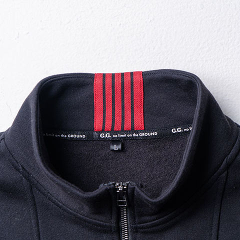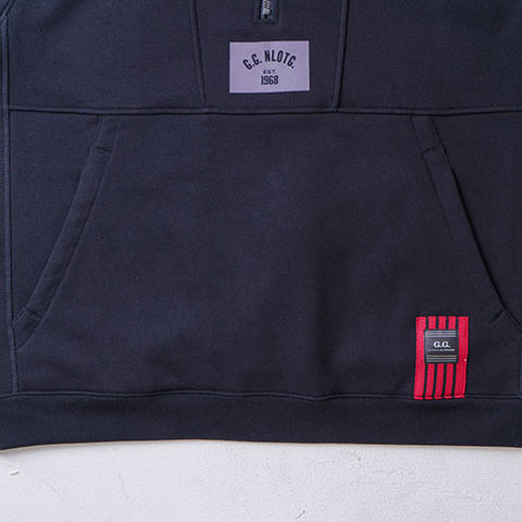 | 衿元ロゴ入りラインテープ、胸元ロゴプリント、両脇ポケット、後ろニットラインテープ、袖口リブ、裾リブ |