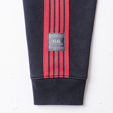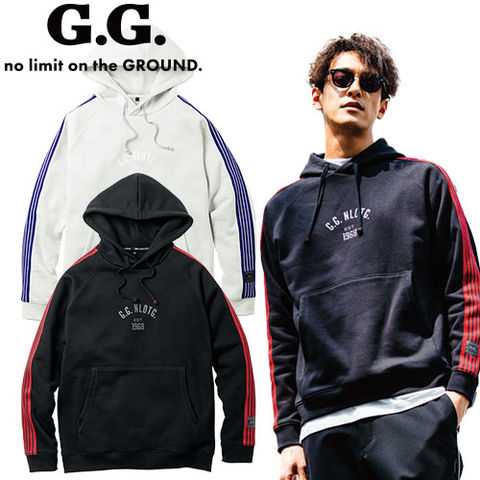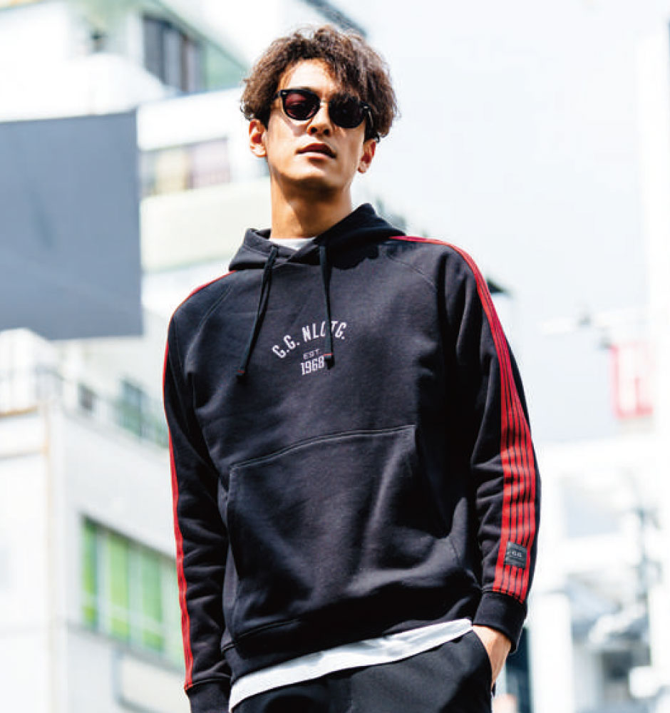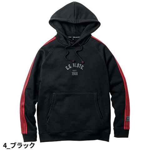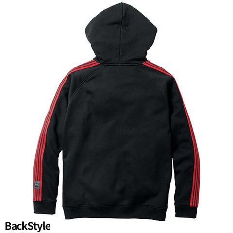 | 衿元ロゴ入りラインテープ、フード絞りスピンドル、胸元ロゴプリント、カンガルーポケット、袖ニットラインテープ、袖反射ネーム、袖口リブ、裾リブ |