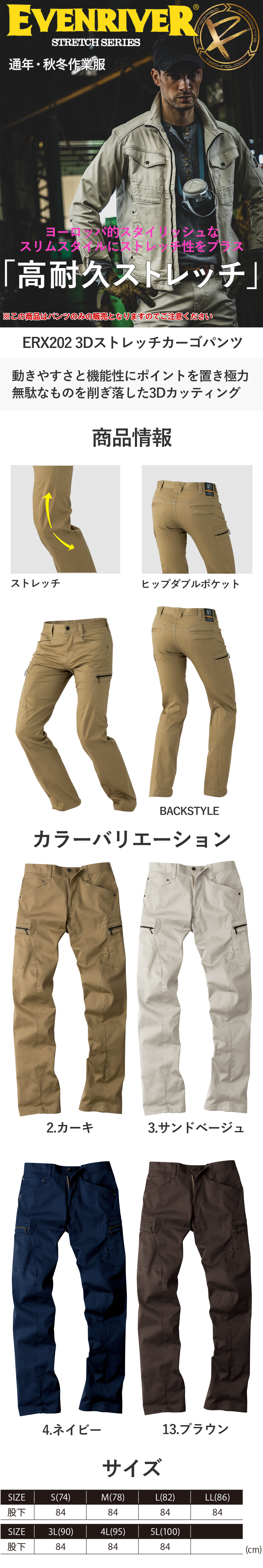 カーゴパンツ イーブンリバー EVENRIVER ERX202 ストレッチ 耐久性 スリム 綿 3Dストレッチカーゴパンツ ワークパンツ 作業着 作業服 作業ズボン スラックス おしゃれ 人気 安い かっこいい ワーク マン メンズ レディース 通年