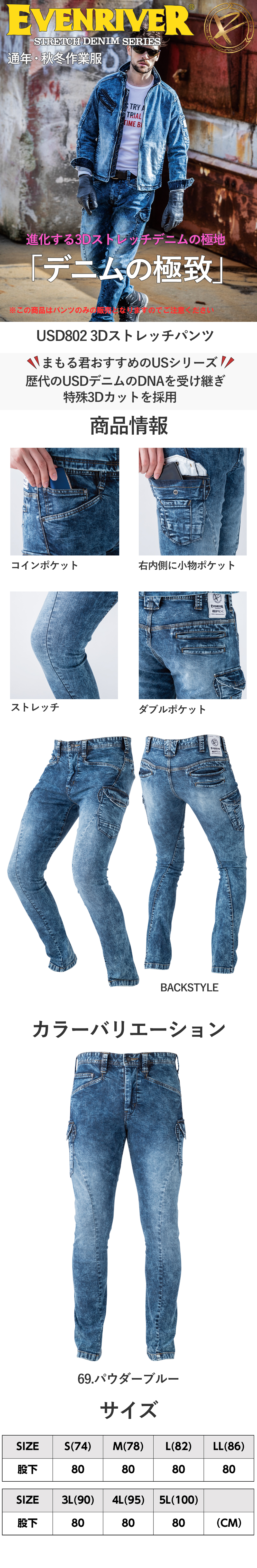 作業服 デニム イーブンリバー EVENRIVER ストレッチパウダーデニムカーゴ USD802 作業着 通年 秋冬
