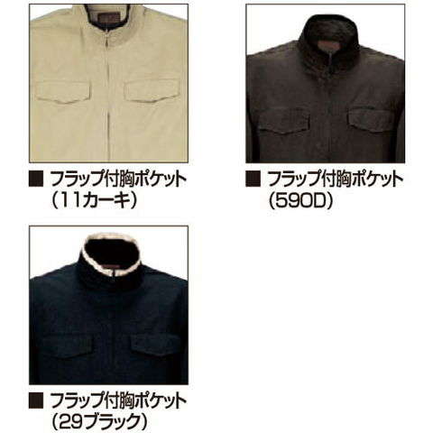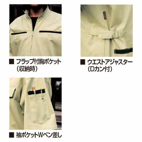 | ソフトウォッシュ加工、フラップ付胸ポケット、袖ポケットWペン差し、ウエストアジャスター(Dカン付) |