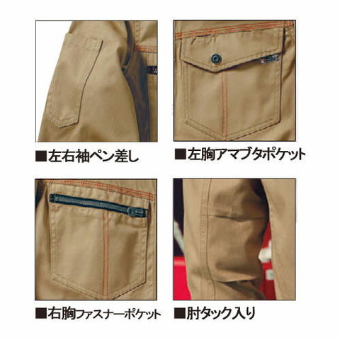 袖口ドットボタン、右胸ファスナーポケット、左胸アマブタポケット、肘タック入り