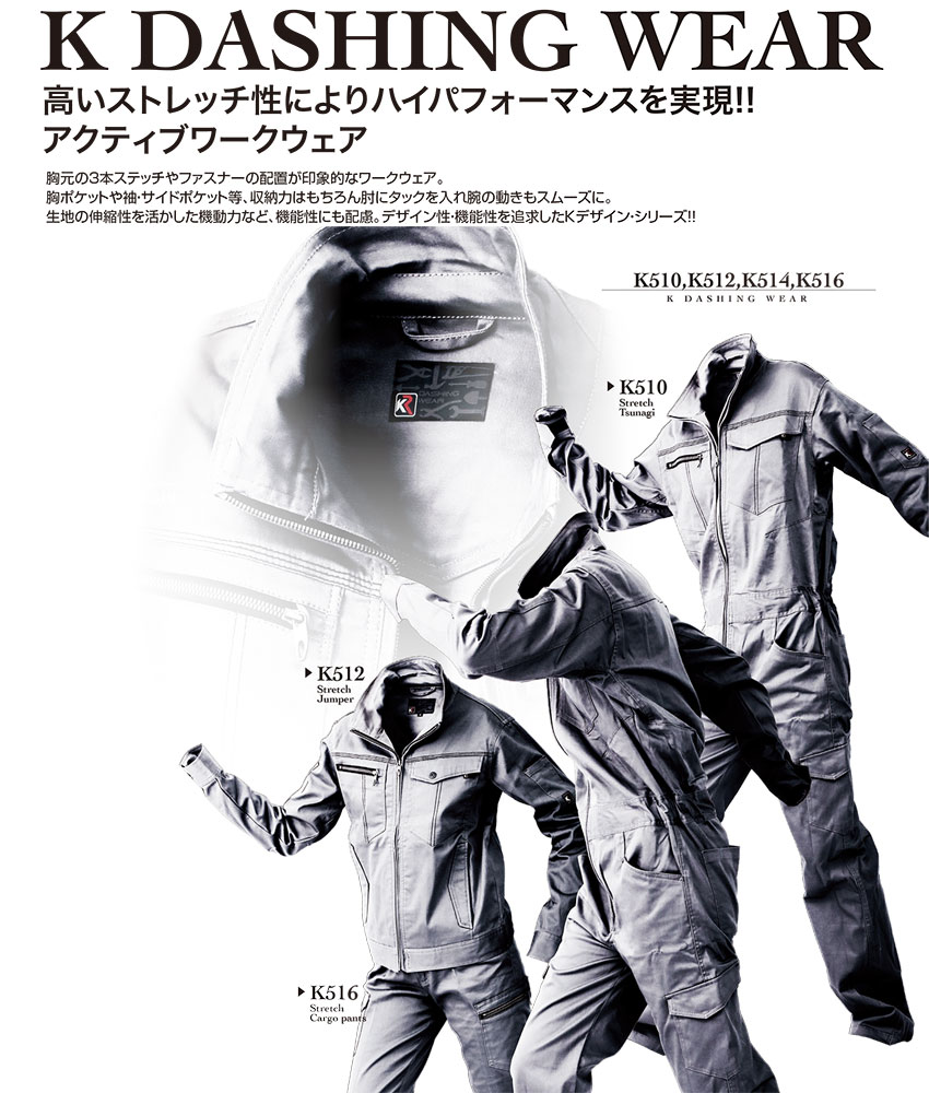 胸元の3本ステッチやファスナーの配置が印象的なワークウェア。胸ポケットや袖・サイドポケット等、収納力はもちろん肘にタックを入れ腕の動きもスムーズに。生地の伸縮性を活かした機動力など、機能性にも配慮。デザイン性・機能性を追求したKデザイン・シリーズ!!
