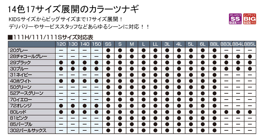 KIDSサイズからビッグサイズまで17サイズ展開!デリバリーやサービススタッフなど、あらゆるシーンに対応!!