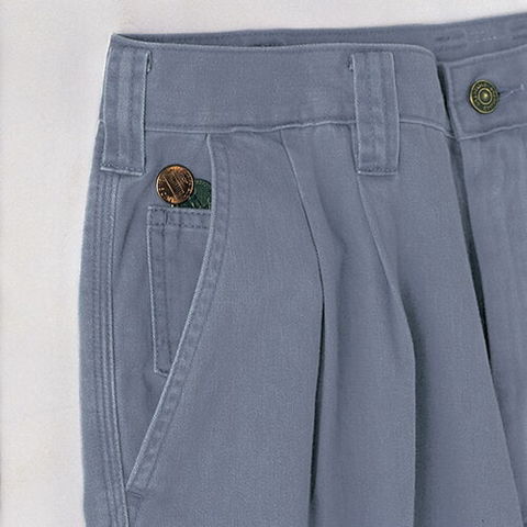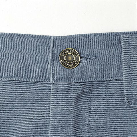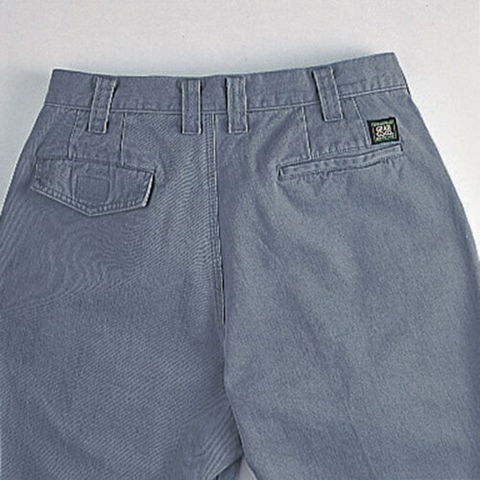 | 1.グランシスコオリジナルボタン 2.コインを収納できるパッチポケット 3.動きの激しい股部分を棒シックで補強 4.トリプルステッチ 5.バックのベルトループはシンプルな2本使い |
