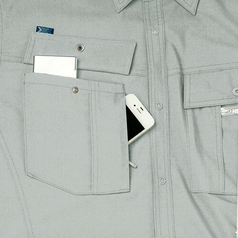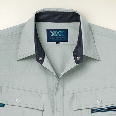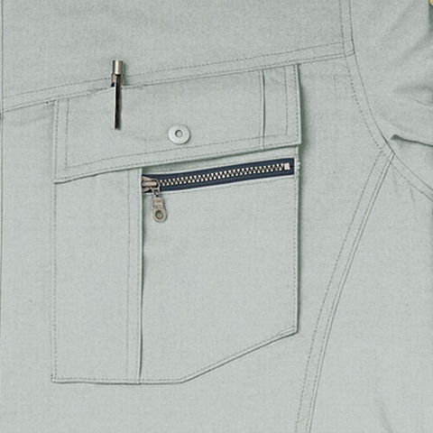 | 1.スマートフォンも収納できる便利な右胸ダブルポケット(縦ファスナー付) 2.左胸ペン差し付ダブルポケット(マゴポケファスナー付) 3.左袖ペン差し 4.衿部分には高吸水・速乾・制電ニット(東レエアファイン)を使用 5.動きやすさに涼しさをプラスしたメッシュノーフォーク |