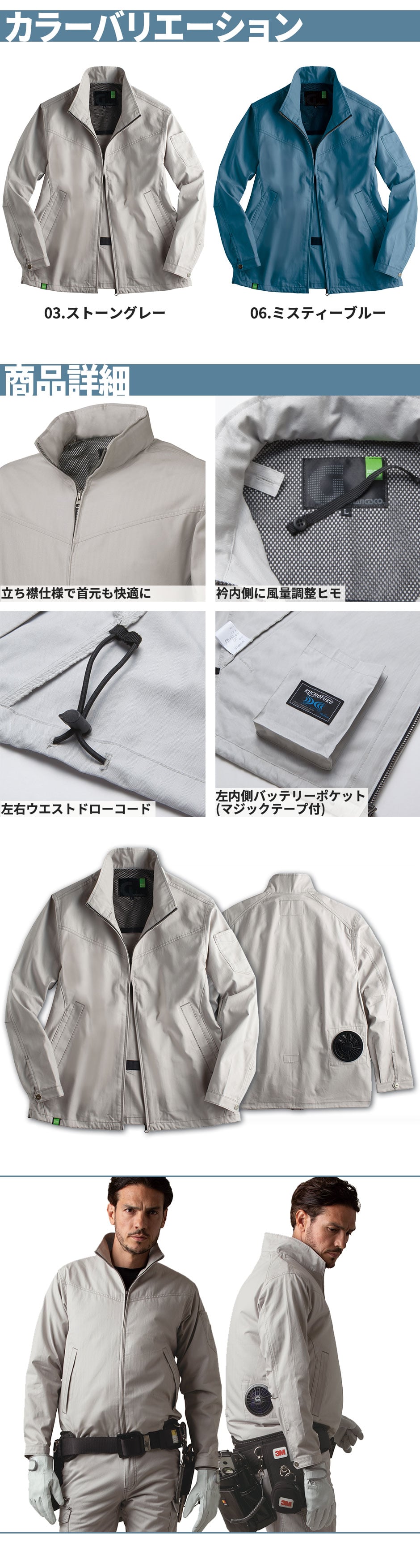 | 立ち襟仕様で首元も快適に、衿内側に風量調性ヒモ、左内側バッテリーポケット(マジックテープ付)、左右ウエストドローコード、金属ボタン、フロントファスナー |