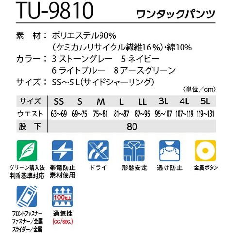| グリーン購入法判断基準対応、帯電防止素材、ドライ、形態安定、透け防止、通気性(cc/sec.) |