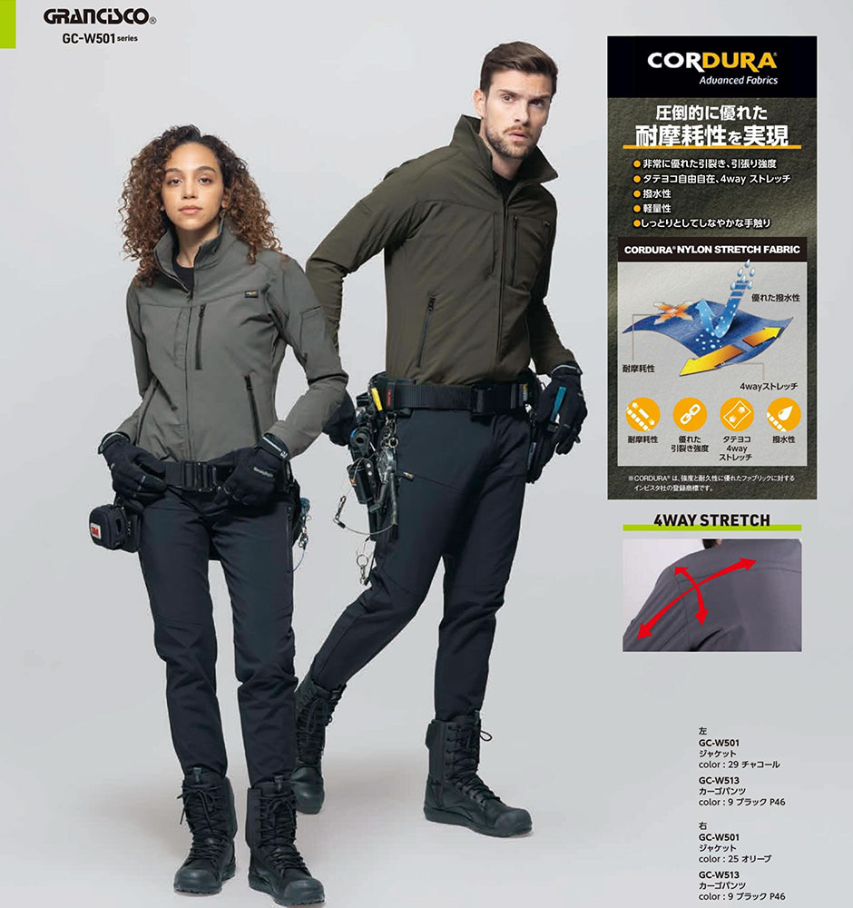 | 4WAYストレッチ、撥水加工、耐摩耗性、優れた引裂き強度 |