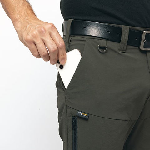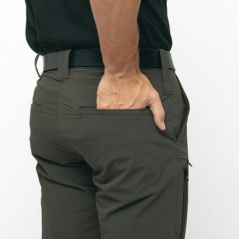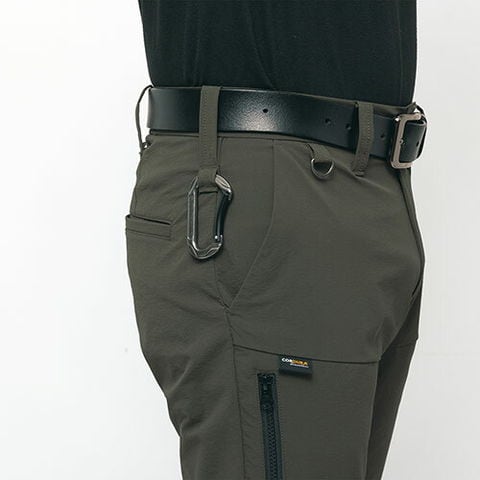 | 腰裏ロゴプリント/ウエストカーブベルト仕様により着用感と動きやすさが向上/左右ベルトループはカラビナループ仕様/腰ポケット右側キーリング/両側ファスナー付きポケット/縦横方向に伸縮するストレッチ/後ろポケット/金属ボタン/樹脂ファスナー/金属スライダー |