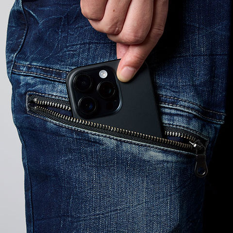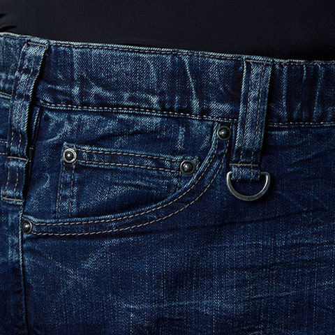 | ウエストゴム、大きめコインポケット、右腿ファスナーポケット、左腿玉縁ポケット |