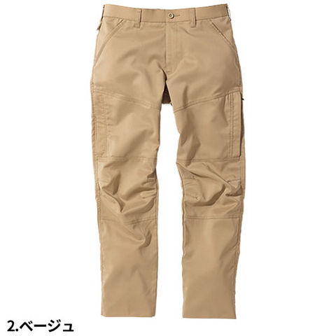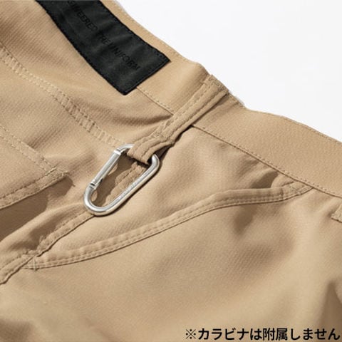 | カラビナループ、メッシュポケット、ウエスト横ストレッチ、ひざダーツ、後ろ切り替えし、左右ファスナーつき縦カーゴポケット |