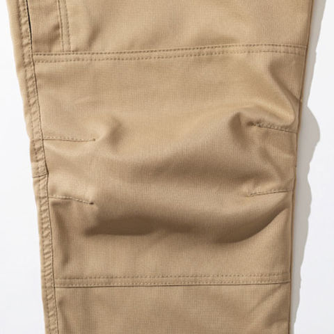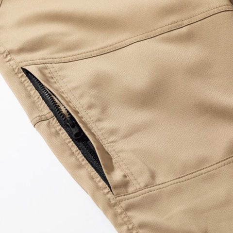 カーゴパンツでありながらデザインはスラックスの様にスッキリしたソリッドカーゴパンツ。 ファスナーの凹凸物を隠すことでよりスッキリしたイメージに仕上げ実際にワークする際に取扱い商材などを傷つけにくいように配慮されています。