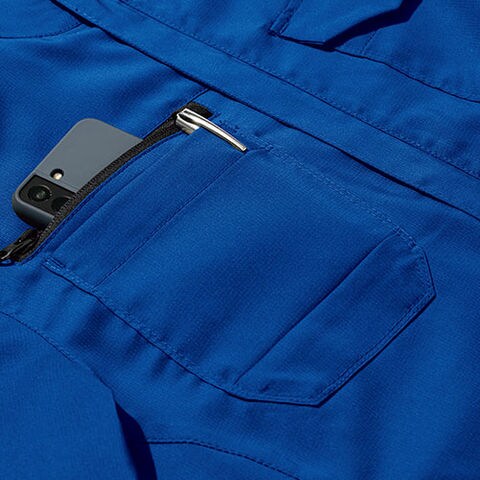 ファスナーやボタンなどの凹凸物を隠すことでよりスッキリしたイメージに仕上げ実際にワークする際に取扱い商材などを傷つけにくいように配慮されています。