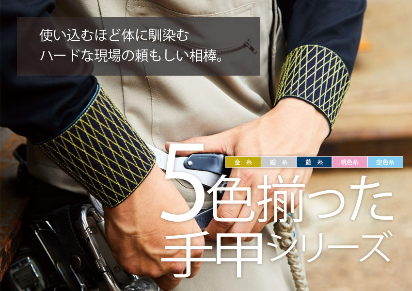 人気の祭りシリーズの手甲。5色展開ではっぴの色に合わせてお選びいただけます。無骨な職人と祭りの汗が似合う。鯉口や股引きと組み合わせてビシッと決めて自分らしく着こなそう