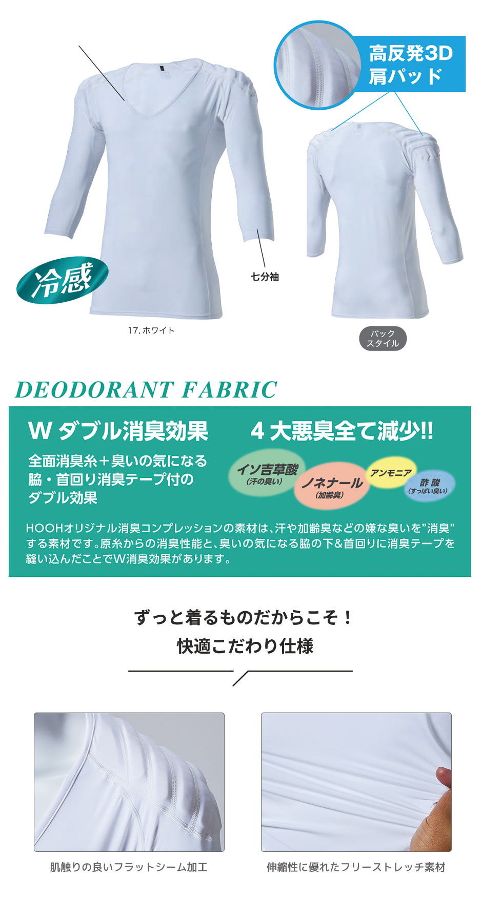 | 高反発3D肩パッド、肌触りの良いフラットシーム加工、伸縮性に優れたフリーストレッチ素材、HOOHのオリジナル消臭コンプレクションの素材は、汗や加齢臭などの嫌な臭いを消臭する素材です。原糸からの消臭性能と、臭いの気になる脇の下&首回りに消臭テープを縫い込んだことでW消臭効果があります。 |