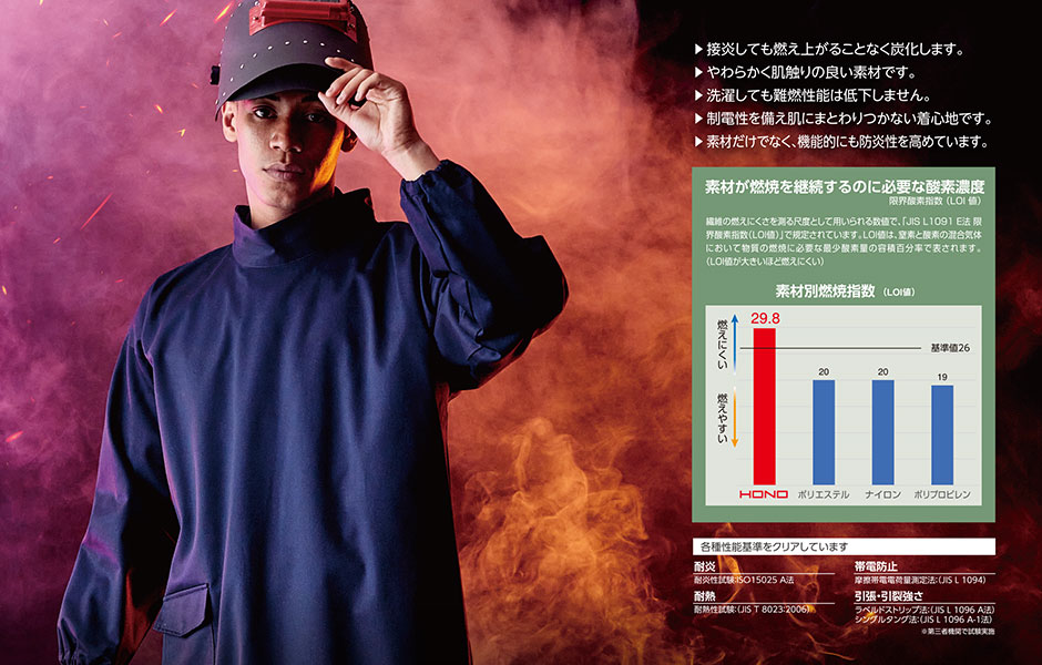 | 耐炎 耐炎性試験:ISO15025 A法 耐熱 耐熱性試験:(JIS T 8023:2006) 帯電防止 摩擦帯電電荷量測定法:(JIS L 1094) 引張・引裂強さ ラベルドストリップ法:(JIS L 1096 A法) シングルタング法:(JIS L 1096 A-1法) 村上被服のHONOシリーズは、JISの規格にのっとった各種試験の基準をクリアしており、難燃性の評価には自信があります! |