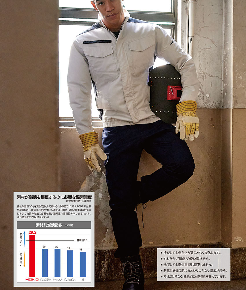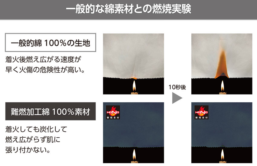 | 接炎しても燃え上がることなく炭化します 強くて肌触りの良い素材です 洗濯しても難燃性能は低下しません 制電性を備え肌にまとわりつかない着心地です 素材だけでなく、機能的にも防炎性を高めています |