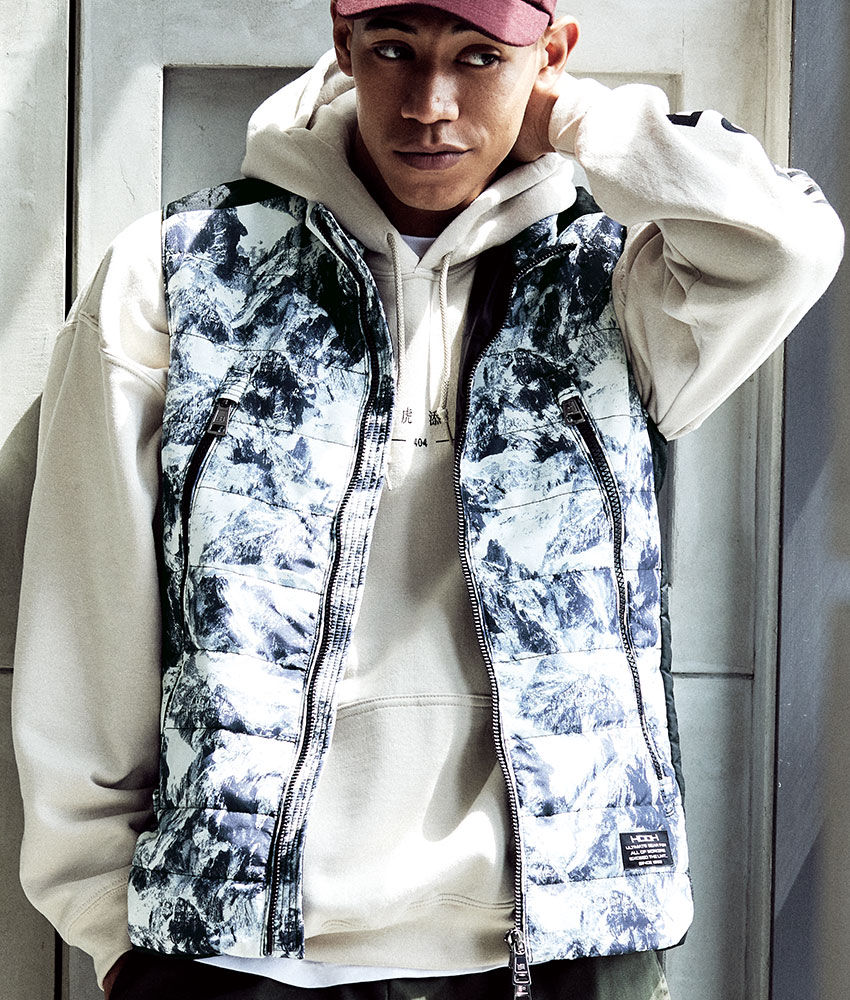 | 両脇ファスナー付ポケット、上下2つに別れたポケット、フロントダブルファスナー、左胸内ポケット、ロゴ入りスライダー |