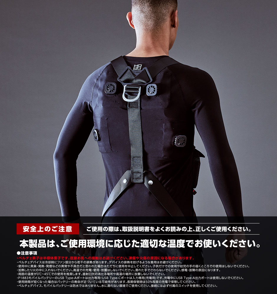 | ご使用の際は取扱説明書をよくお読みの上、正しくご使用ください。 本製品はご使用環境に応じた適切な温度でお使いください。 ・ペルチェ素子は半導体素子です。直接お肌への接触はお避けください。凍傷や火傷の原因になる場合があります。 ・ペルチェデバイスは冷却時にファン部分から若干の排熱があります。デバイスの排熱を妨げるような着用はお避けください。 ・使用中に異臭・発熱・発煙などの異常や不具合だと思われた場合はただちに使用を中止してください。 ・子供だけでの使用や幼児の手の届くところでの使用はしないでください。 ・加熱したり火の中に入れないでください。 ・高温での充電・使用・放置はしないでください。 ・濡れた手でさわらないでください。感電・故障の原因になります。 ・周囲の温度が0℃~45℃での使用を推奨します。 ・直射日光のあたる場所や高温の場所に放置しないでください。 ・使用時間が短くなった場合はバッテリーの寿命が近づいている可能性があります。長期保管時は50%程度の充電で保管してください。 ・ペルチェデバイス、モバイルバッテリーは防水ではありません。水に濡れない環境でご使用ください。 ・ペルチェデバイス、モバイルバッテリーの接続には必ず付属のスイッチを使用してください。 |