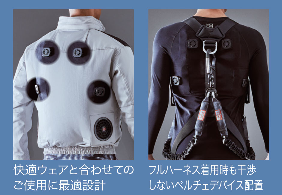 ファン付き快適ウェアと組み合わせてお使いいただくことによりファンの風とペルチェの冷却でより涼しさを感じることができます。