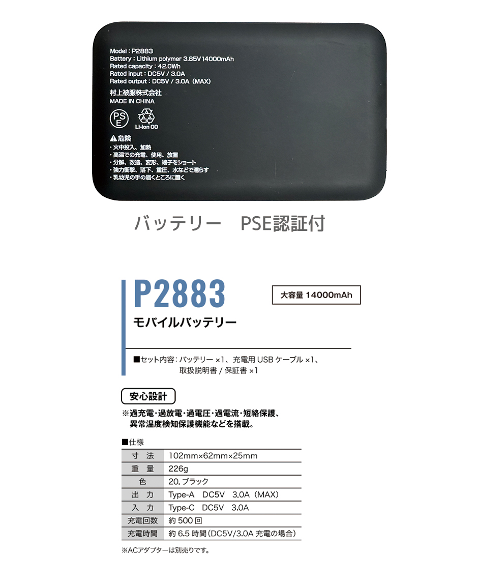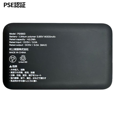 | 届出事業者名:村上被服株式会社 PSマークの種類:PSE made in China |