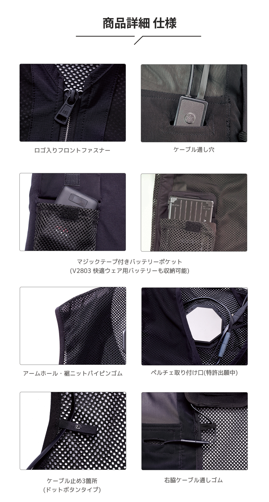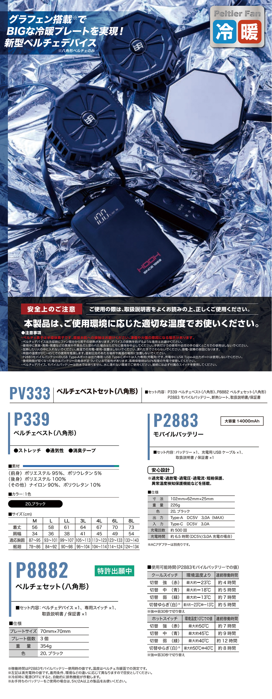 | ■ペルチェ プレートサイズ/70mm×70mm プレート個数/3個 重量/354g ■使用可能時間(P2883使用時) クール 強(赤):環境温度より最大約-23℃ 連続稼働時間/約4時間 中(青):環境温度より最大約-18℃ 連続稼働時間/約5時間 弱(緑):環境温度より最大約-13℃ 連続稼働時間/約7時間 ゆらぎ(白)※:環境温度より最大約-23℃⇔-13℃ 連続稼働時間/約5時間 ホット(環境温度10℃) 強(赤):最大約50℃ 連続稼働時間/約7時間 中(青):最大約45℃ 連続稼働時間/約9時間 弱(緑):最大約40℃ 連続稼働時間/約12時間 ゆらぎ(白)最大約50℃⇔40℃ 連続稼働時間/約8時間 ※ゆらぎモード時強弱30秒切替 ※P2883使用時 ※満充電時 ※冷却時に電源OFFにすると、自動的に排熱機能が作動します。 ※お手持ちのバッテリーをご使用の場合は、5V/2A以上の製品をお使いください。 ■バッテリー仕様 寸法:102mm×62mm×25mm 重量:226g 出力:Type-A DC5V 3.0A(MAX) 入力:Type-C DC5V 3.0A 充電回数:約500回 充電時間:約6.5時間(DC5V/3.0A充電の場合) ※ACアダプター別売 ■ベスト仕様 ロゴ入りフロントファスナー/マジックテープ付きバッテリーポケット/ケーブル通し穴/アームホール・裾ニットパイピンゴム/ペルチェ取り付け口(特許出願中)/ケーブル止め4か所(ドットボタンタイプ)/右脇ケーブル通しゴム |