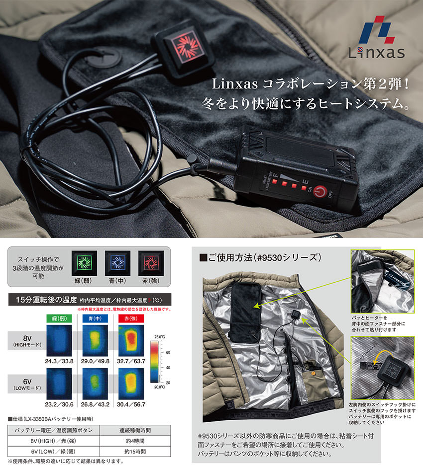 | ※#9530シリーズ以外の防寒商品にご使用の場合は粘着シート付面ファスナーをご希望の場所に接着してご使用ください。 ※バッテリーは別売です。 |