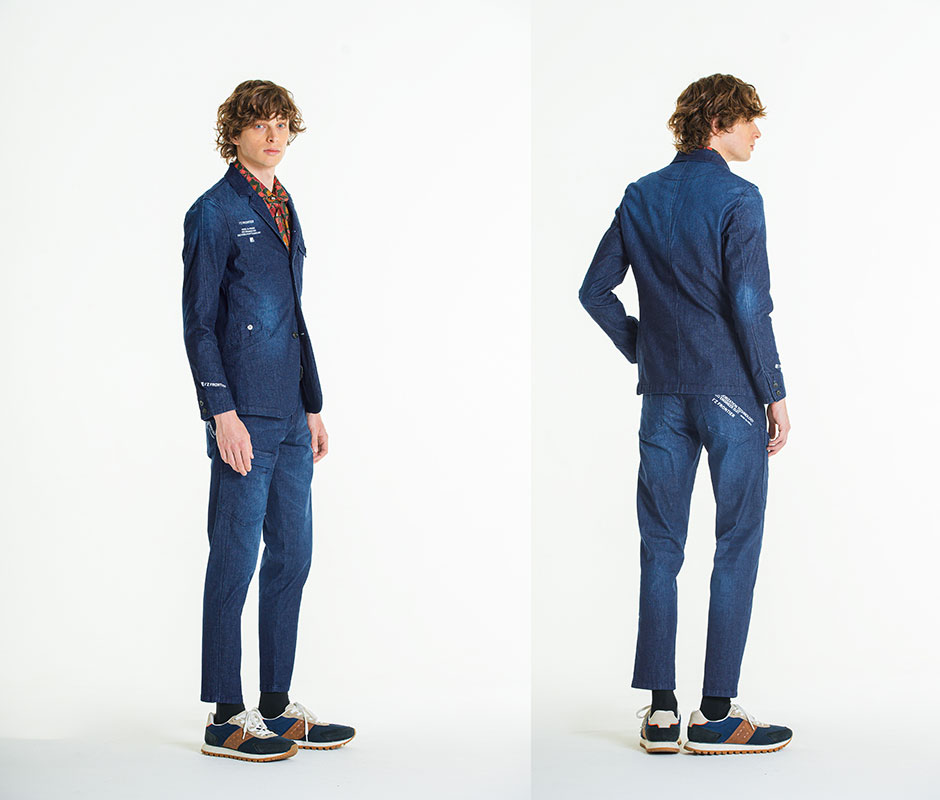 ・従来のスーツでは類を見ないポップなルックス。オン・オフ問わず様々なシーンに対応するカジュアル感が大きな魅力。全パーツに抜染プリントを施した99番色の存在感は圧巻の一言です。