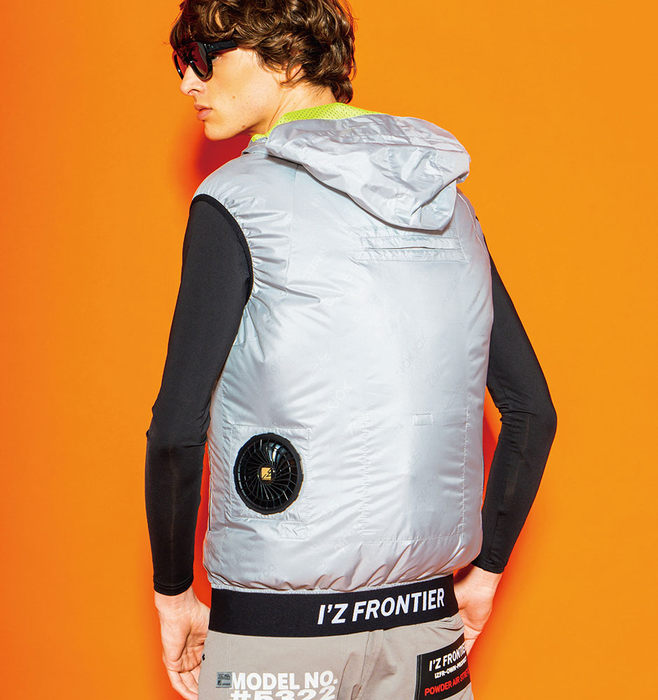 | ファスナー付きランヤード取付口、ヘルメットの上から被れるフード、首後ろの立体構造で衣服内を風が駆け巡る、スマホが入る縦ファスナー付き胸ポケット、首後ろの空気の流れを作る2層構造、高い遮熱性とUVカット率で衣服内温度上昇を抑える裏アルミコーディング、背中に空気を冷やす保冷剤用ポケット |
