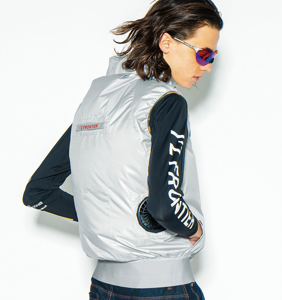 | ハーネス用フック掛け、ファスナー付きランヤード取付口、縦ファスナー付き胸ポケット、個性的なプリントを施した左脇ダブルポケット、首後ろの立体構造で衣服内を風が駆け巡る、首後ろの空気の流れを作る2重構造、高い遮熱性とUVカット率で衣服内温度上昇を抑える裏アルミコーディング、背中に空気を冷やす保冷剤用ポケット |