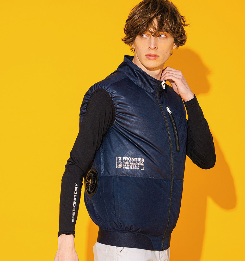 | ファスナー付きランヤード取付口、スマホが入る縦ファスナー付き胸ポケット、風抜けの良い立ち襟スタイル、首後ろの立体構造で衣服内を風が駆け巡る、首後ろの空気の流れを作る2重構造、商品上部に独自な世界観を表現したエンボス加工素材を使用、背中に空気を冷やす保冷剤用ポケット |