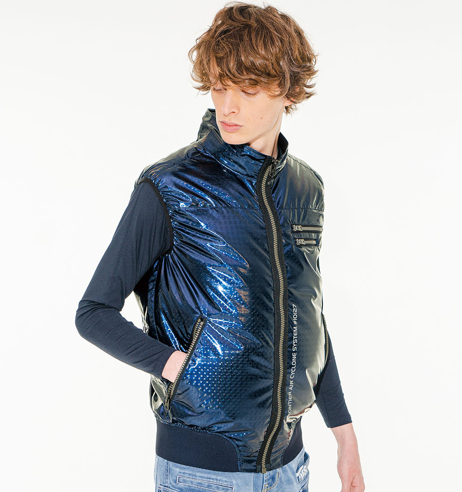 | ハーネス用フック掛け、ファスナー付きランヤード取付口、左胸ダブルファスナーポケット、大型ファスナー付き脇ポケット、首後ろの立体構造で衣服内を風が駆け巡る、首後ろの空気の流れを作る2重構造、唯一無二な表現力を発揮する3Dフィルムラミネート加工、背中に空気を冷やす保冷剤用ポケット |