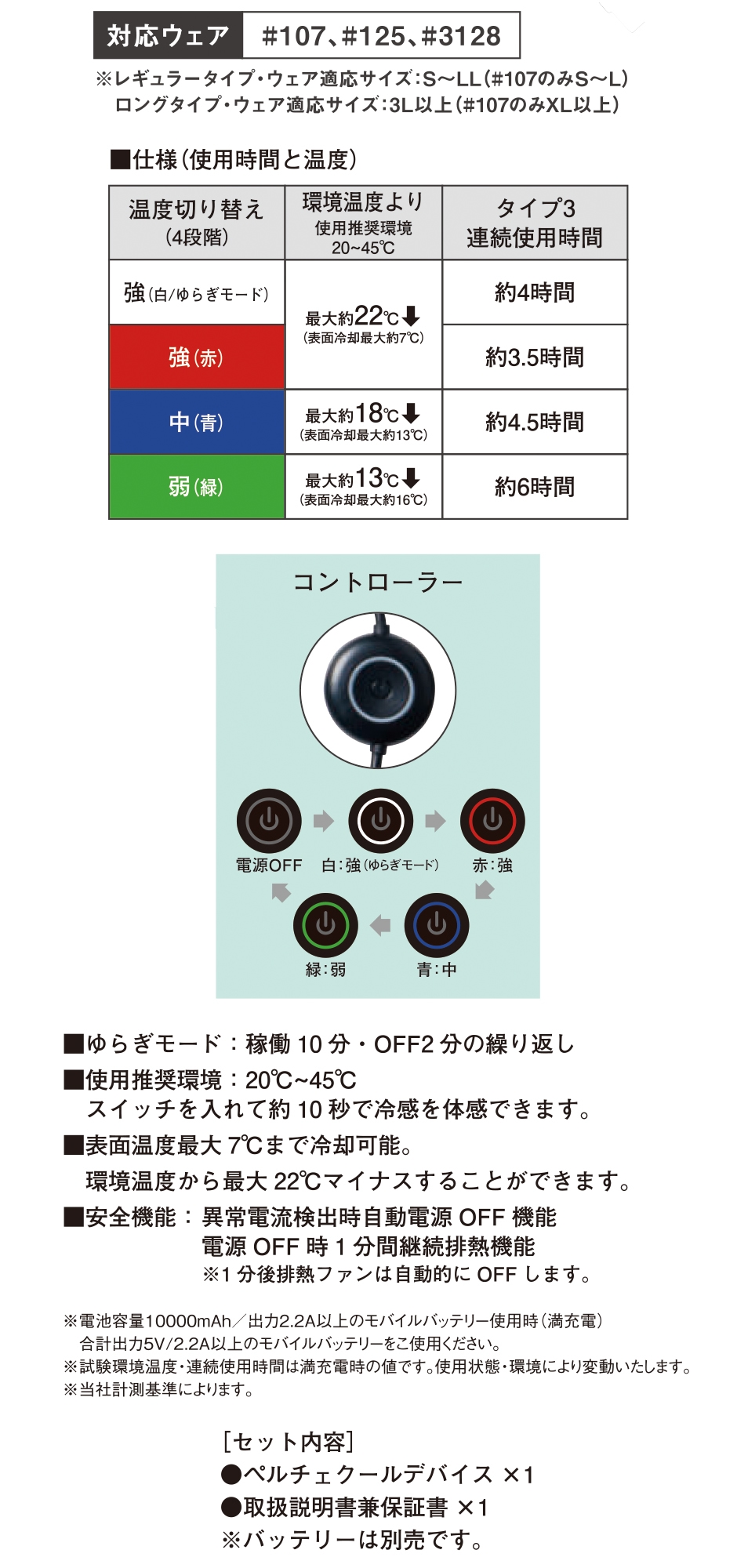 | 対応ウェア:#107、#125、#3128 ゆらぎモード:稼働10分・OFF2分の繰り返し 使用推奨環境:20℃~45℃ スイッチを入れて約10秒で冷感を体感できます。 表面温度最大7℃まで冷却可能(環境温度から最大22℃マイナスすることができます) |
