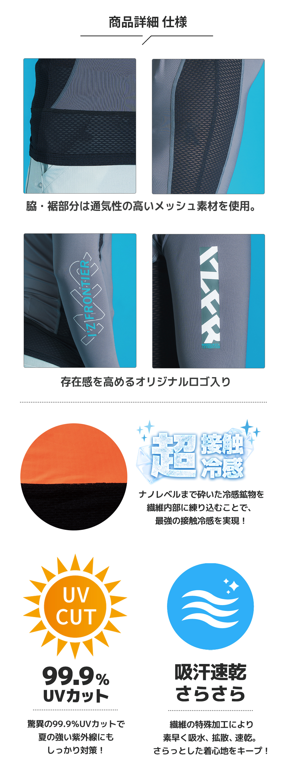 | 接触冷感、遮熱、吸汗速乾、UVカット(99.9%)、吸汗速乾、通気性 |